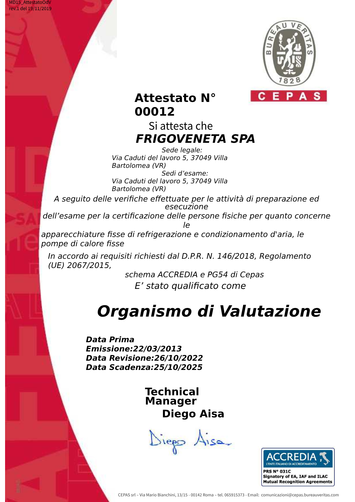Veritas come Organismo di Valutazione dal Regolamento CE303/2008 e dal D.P.R. n° 43 del 27/01/2012.