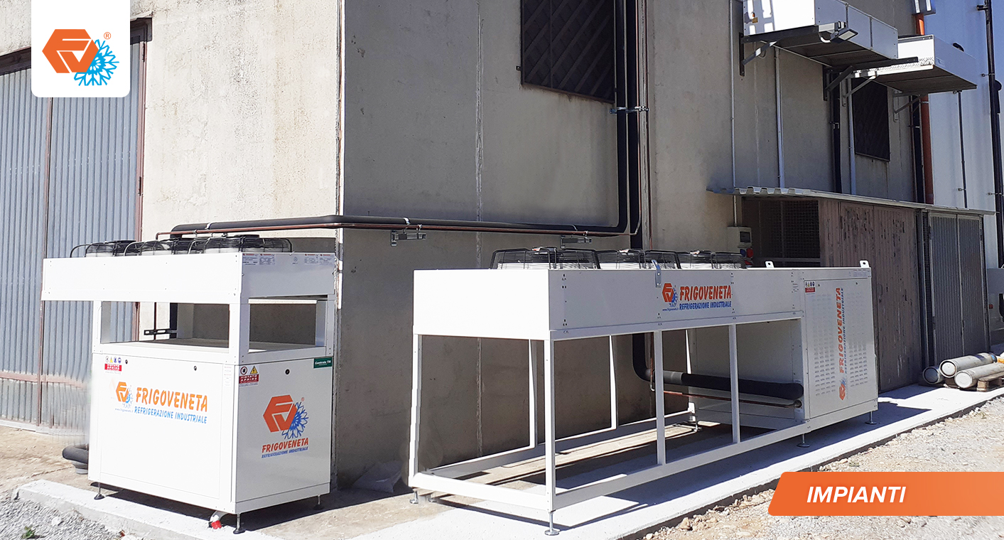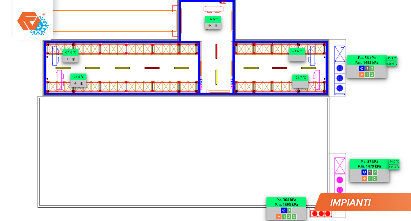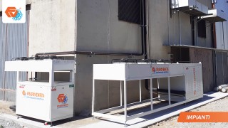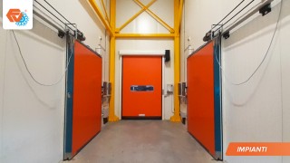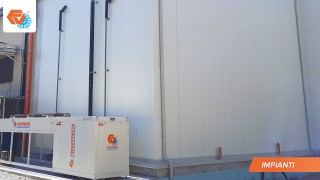 Magazzino frigorifero surgelati "chiavi in mano" autoportante composto da 2 celle frigorifere e una anticella con piano di carico. L'impianto frigorifero è doppio per una maggiore garanzia di funzionamento.