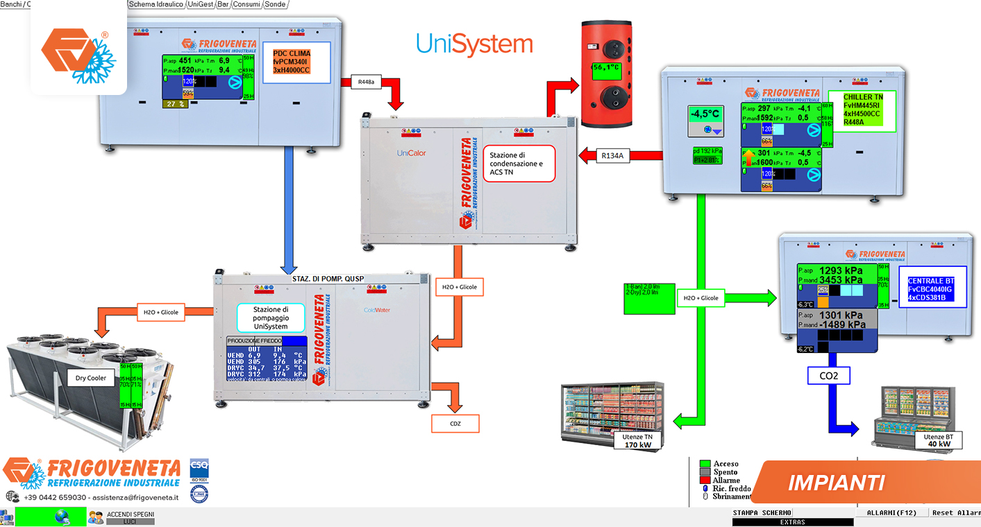 Il sistema UniGest di FRIGOVENETA che è stato installato garantisce la regolazione della temperatura / umidità del pdv e anche ad esempio il cambio di funzionamento stagionale comandando in automatico tutti i servocomandi annessi, inoltre gestisce l’illuminazione del pdv scegliendo in automatico gli scenari previsti per l’ottimizzazione dell’illuminamento con il minimo consumo elettrico.